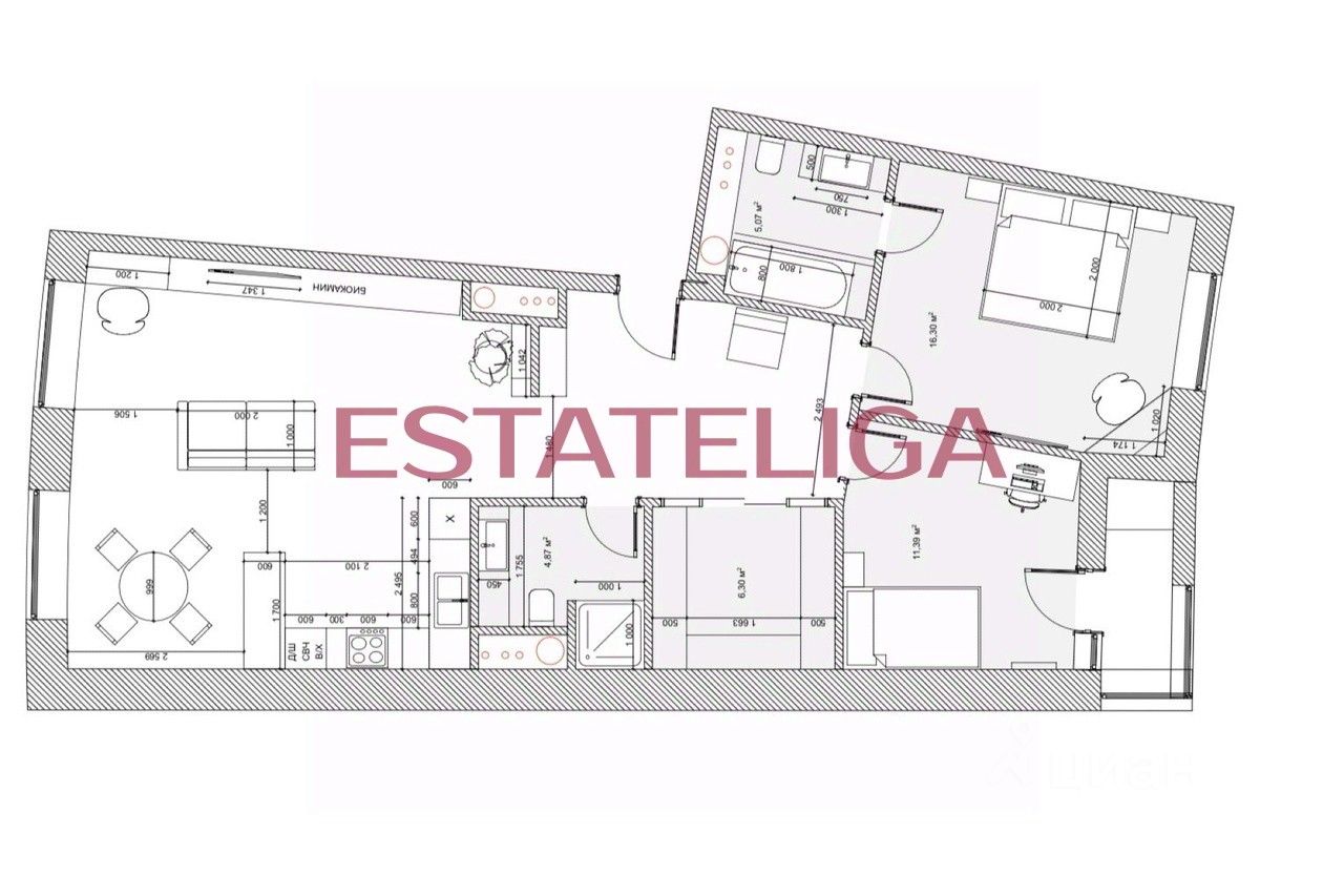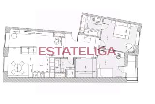 Функциональная планировка квартиры, разработанная по индивидуальному дизайн-проекту: просторная кухня-гостиная, удобная мастер-спальня, уютная комната с выходом на лоджию, можно использовать как детскую комнату или кабинет, два санузла - один с ванной, другой с душем, просторный холл с гардеробом и постирочной зоной.