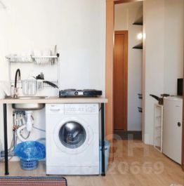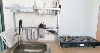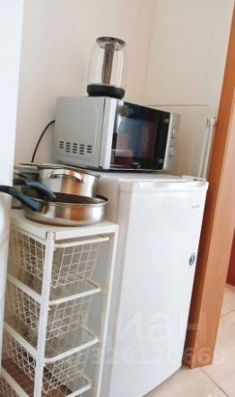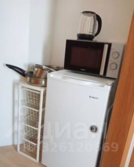 В студии оборудована кухонная зона с мокрой точкой и всей необходимой бытовой техникой (плита, чайник, микроволновка, холодильник) и посудой для приготовления и принятия пищи, обеденная зона (стол и 2 стула), зона отдыха (кресло-кровать и односпальная кровать), а также душевая кабина.
