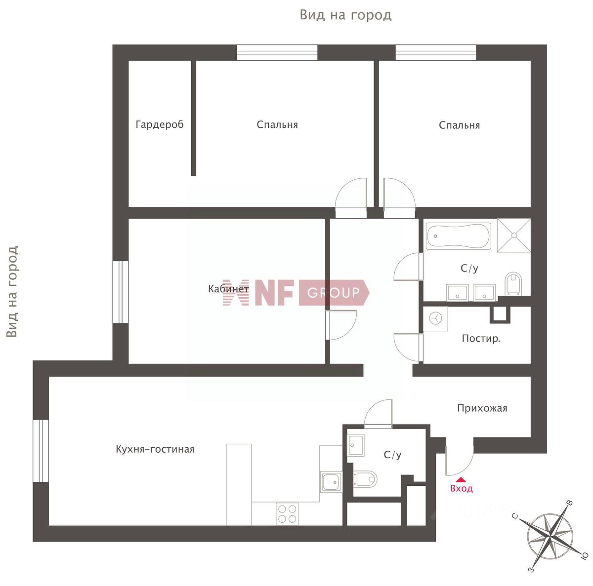 Планировка: гостиная-кухня, мастер-спальня с гардеробной, гостевая спальня, кабинет, 2 полноценных санузла, гардеробная при входе, постирочная.