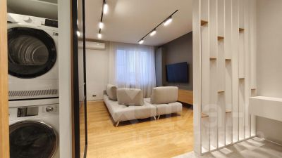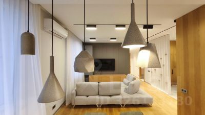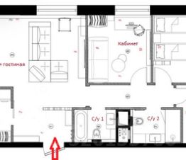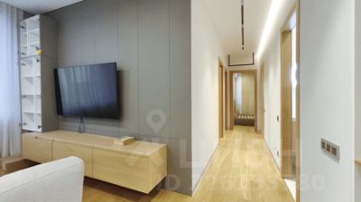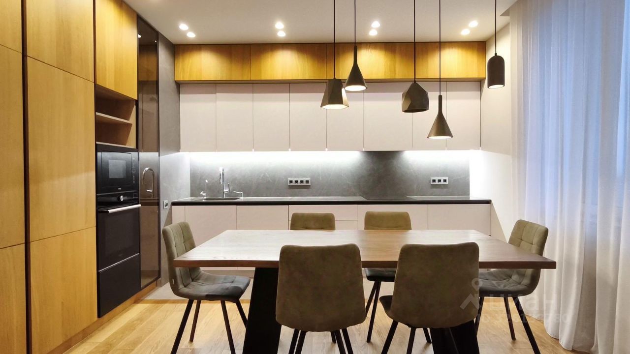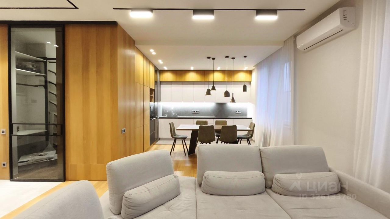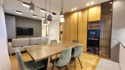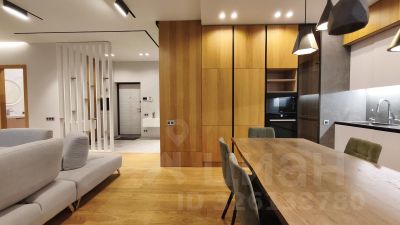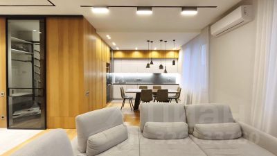 Объединенная кухня-гостиная, три спальни и два санузла, отдельная гардеробная комната.