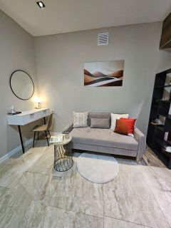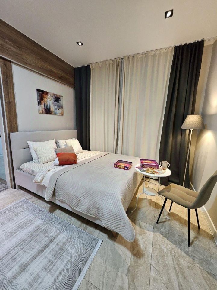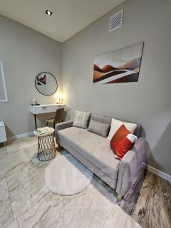 - Уютные спальные места: Мягкая кровать с ортопедическим матрасом (160x200 см) и раскладной диван в гостиной (140x200 см) со свежим постельным бельем.