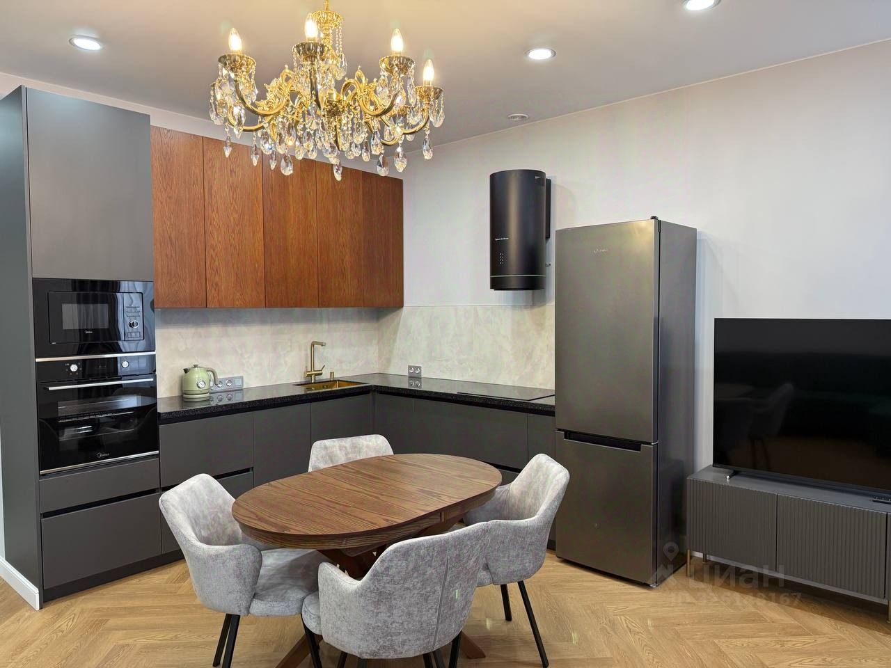 Установлено достаточное количество различного освещения. Кухня укомплектована качественной новой бытовой техникой.