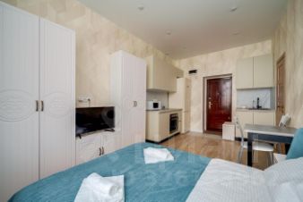 Студия подойдет для проживания 2 гостей. В апартаментах есть все для комфортного проживания: двуспальный диван 160 на 200, SMART-TV и высокоскоростной Wi-Fi, стиральная машинка, утюг, гладильная доска, сушилка для белья, фен. Мини-кухня оснащена холодильником, индукционной варочной панелью, СВЧ-печью, электрическим чайником, необходимой посудой и столовыми приборами. Постельное белье, полотенца, шампунь, гель для душа, жидкое мыло предоставляются.