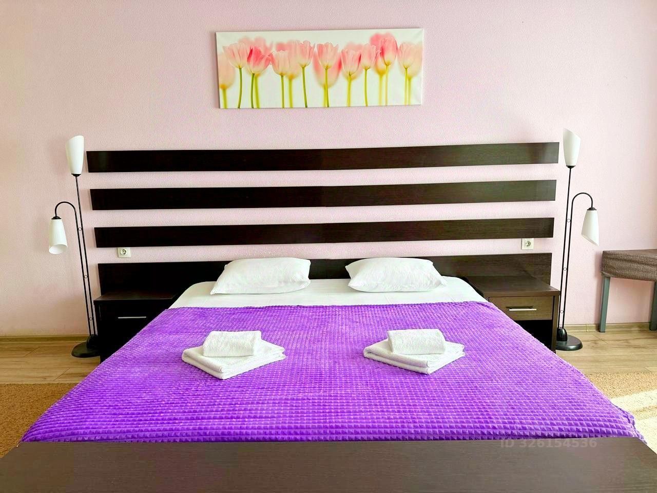 Номер с одной двуспальной кроватью и санузлом (ванная и душевая). В номере есть зона отдыха, мини-кухня с холодильником, посудой, микроволновкой и чайником. Также, своя гардеробная, плоский телевизор, косметические принадлежности, халат и тапочки.