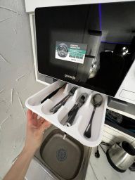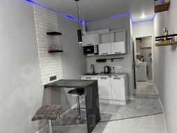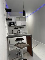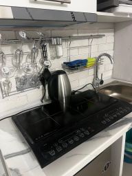 После прохода в основную студию слева располагается кухонная гарнитура, где можно легко приготовить ужин. Кухонная гарнитура оборудована компактной 2-конфорочный сенсорной плитой,чайником, чашками, посудой, бокалами, все и столовыми приборами, а также кастрюлей и сковородкой.