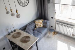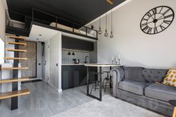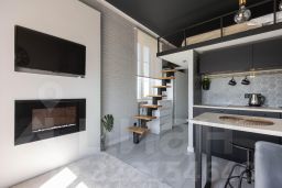 Апартаменты двухуровневые для 1-4-х гостей. На втором этаже расположена двухспальная кровать . На первом этаже диван-кровать(140*190). В студии есть все необходимое для вашего комфорта : полностью оборудованная мини-кухня, бытовая техника (варочная поверхность, микроволновая печь, холодильник, стиральная машинка, посудомоечная машина ) электрический камин, телевизор, гладильная доска, сушилка, утюг, шампунь/гель/мыло, фен