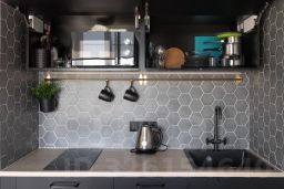 полностью оборудованная мини-кухня, со всей необходимым (варочная поверхность, микроволновая печь, холодильник, стиральная машинка, посудомоечная машина )