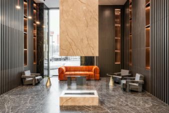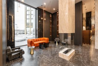 Уютное лобби с высокими потолками и мягкой мебелью для встреч и деловых переговоров;