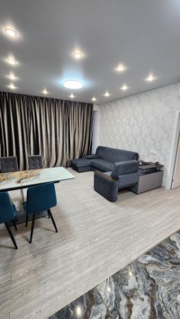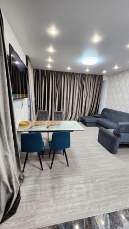 Сдаётся квартира евро-трешка с панорамными окнами.Квартира имеет удобную планировку: Гостиная с большой кухней, где Вас порадует домашняя уютная обстановка .Большой удобный диван с огромной плазмой ,холодильник вашей мечты, удобная для хозяйки кухня встроенная вся техника .Гостиная сердце квартиры, где много тёплого света благодаря окнам в круговую . Которые лёгким движением руки можно закрыть плотными приятными шторами (которые на фото).