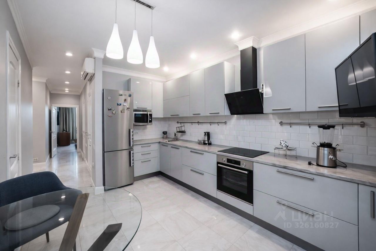 Кухня укомплектована всей необходимой техникой и мебелью: посудомоечная машина, холодильник, телевизор, микроволновая печь, стол и два стула, кондиционер.