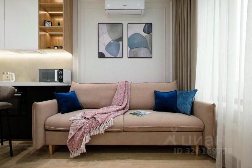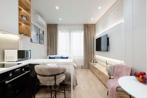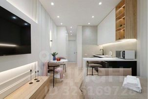 Удобства: Двуспальный диван, кухонная зона с электроплитой и духовкой, барная стойка.