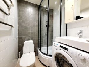 Санузел совмещенный, оснащен полотенцесушителем, душевой кабиной, стиральной машиной.