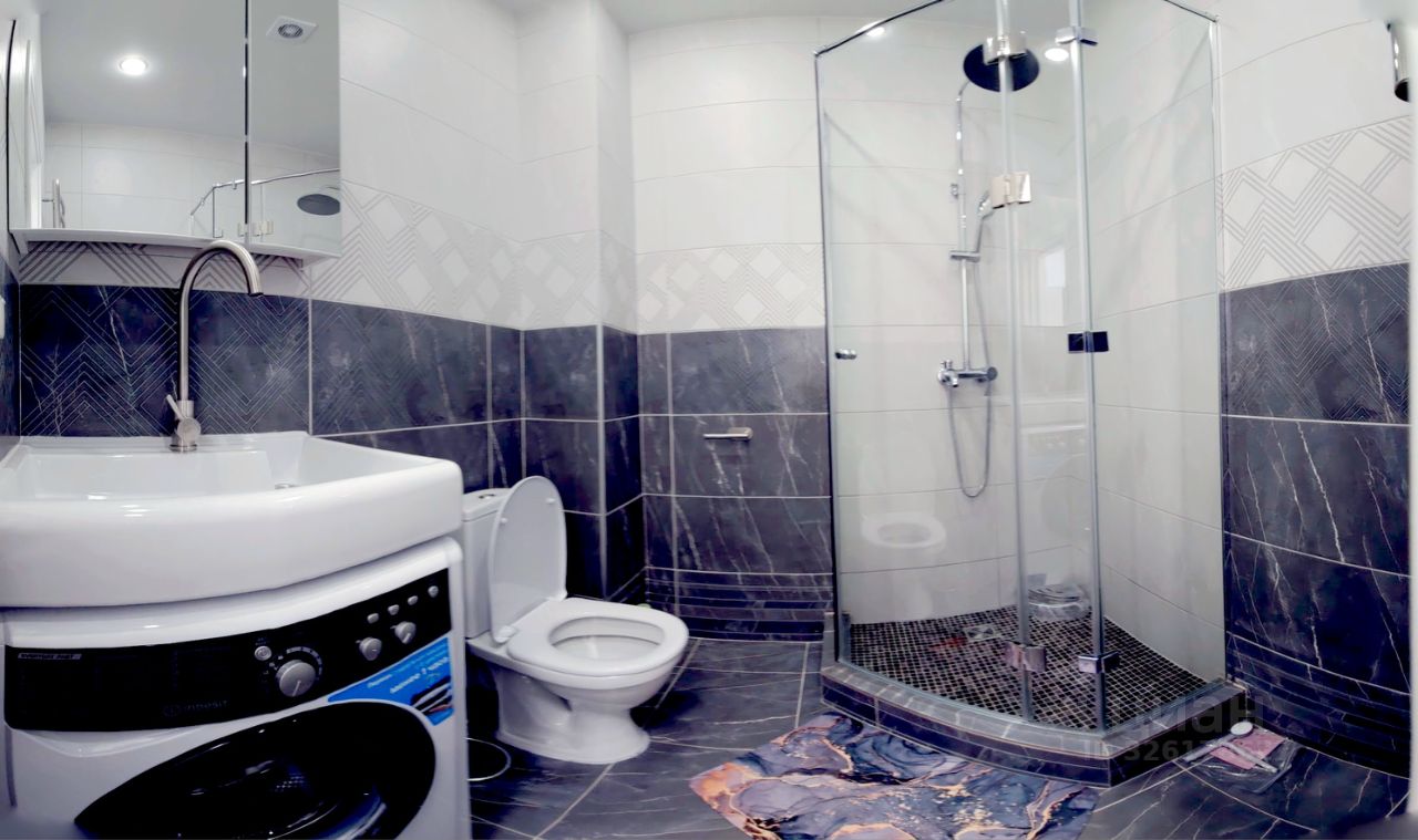 Санузел совмещенный: туалет и полноценная душевая кабина.