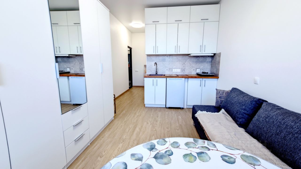 Есть все для проживания: 5-ти створчатый шкаф, раскладной диван, стиральная машина, плита индукционная, чайник, вытяжка, холодильник с морозильной камерой.