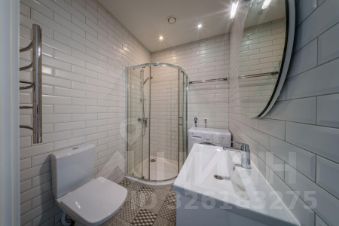 В квартире один совмещенный санузел с душевой кабиной, раковиной, зеркалом с подсветкой и стиральной машиной.