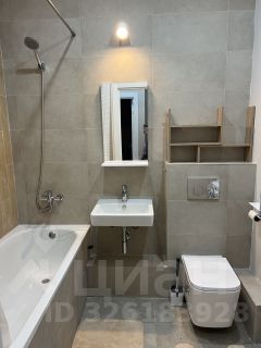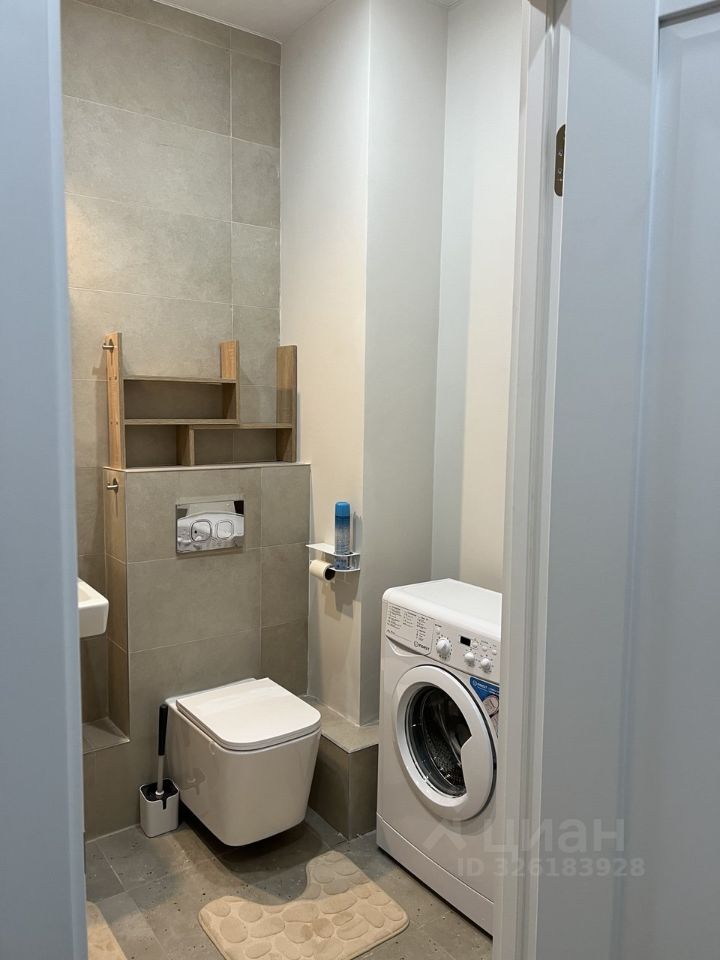 Санузел совмещенный, оформлен в светлых тонах, оснащен ванной и стиральной машиной. Из окон открывается вид на зеленый двор, где предусмотрена подземная парковка за шлагбаумом.