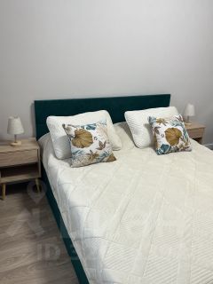 В гостиной установлен современный диван и телевизор, а также обеденный стол с стульями. Кухня оборудована всей необходимой техникой, включая холодильник и микроволновую печь. В спальне большая двуспальная кровать с мягким изголовьем, стильный шкаф и удобный туалетный столик.