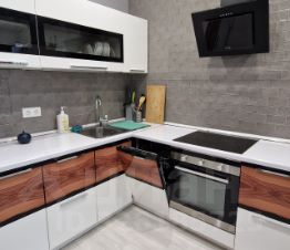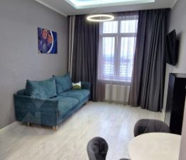 Квартира полностью оборудована современной мебелью и техникой для комфортного проживания, включая кондиционер и посудомоечную машину.