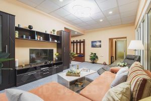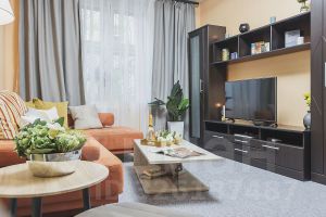 Спальные комнаты оснащены двуспальными кроватями, платяными шкафами, прикроватными тумбами и предметами декора. Просторная гостиная площадью более 30 кв. метров позволит Вам душевно провести время в кругу семьи или небольшой компании друзей. Наличие вместительной гардеробной комнаты сделает Ваше пребывание в квартире более комфортным. В нашей квартире есть все , что может вам потребоваться - бытовая техника, включая стиральную и посудомоечную машины, ЖК-телевизоры, микроволновая печь, холодильник. К Вашим услугам высокоскоростной беспроводной интернет, кабельное телевидение, фен.