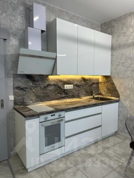 Встроенная кухня оборудована духовым шкафом, варочной панелью и очень мощной вытяжкой фирмы MAUNFELD. Также есть электрический чайник и, по желанию, можем уставить микроволновку.
