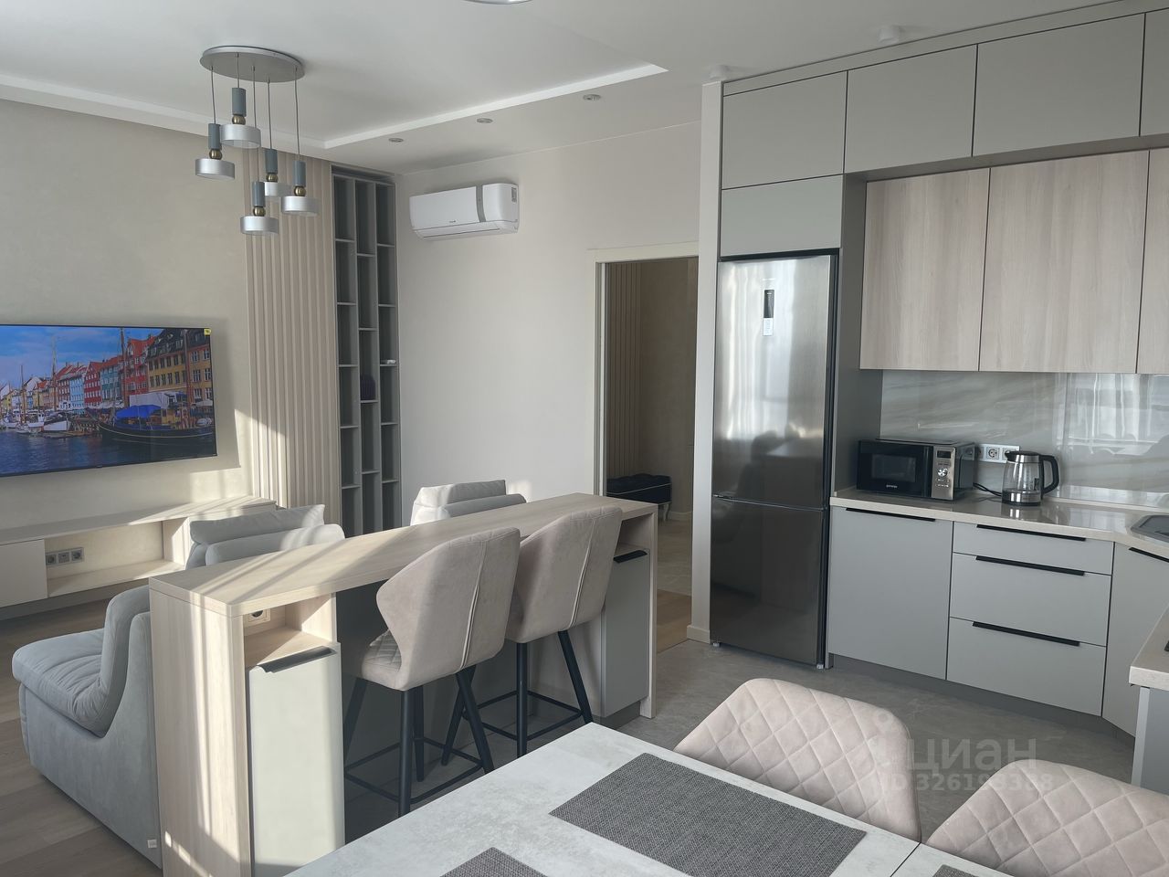 Квартира меблирована и полностью укомплектована всей техникой (включая кондиционер и сушильную машину) и посудой. Имеется 2 полноценных двуспальных места.