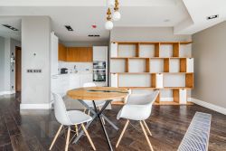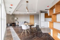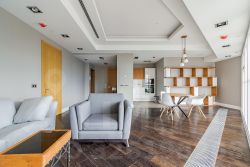 Выполнена авторская отделка в современном лаконичном стиле из натуральных материалов в пастельной гамме, полная комплектация необходимой мебелью и бытовой техникой. Установлены системы кондиционирования и подогрев полов.