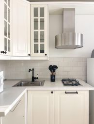 Бытовая техника: стиральная машина, холодильник, вытяжка, варочная панель, микроволновая печь, телевизор, электрический чайник.