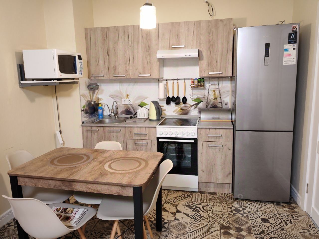 холодильник, микроволновка, электрическая плита с духовкой, вытяжка, электрический чайник, проточный фильтр, посуда, столовые приборы, кастрюли, сковороды.
