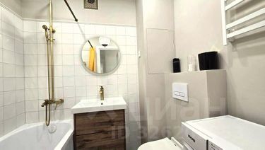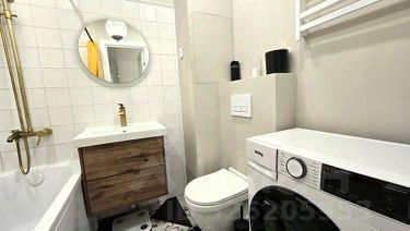 •совмещенный санузел с ванной, унитазом, тумбой с раковиной с мебельным гарнитуром и стиральной машиной.