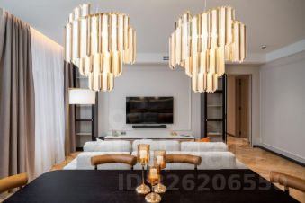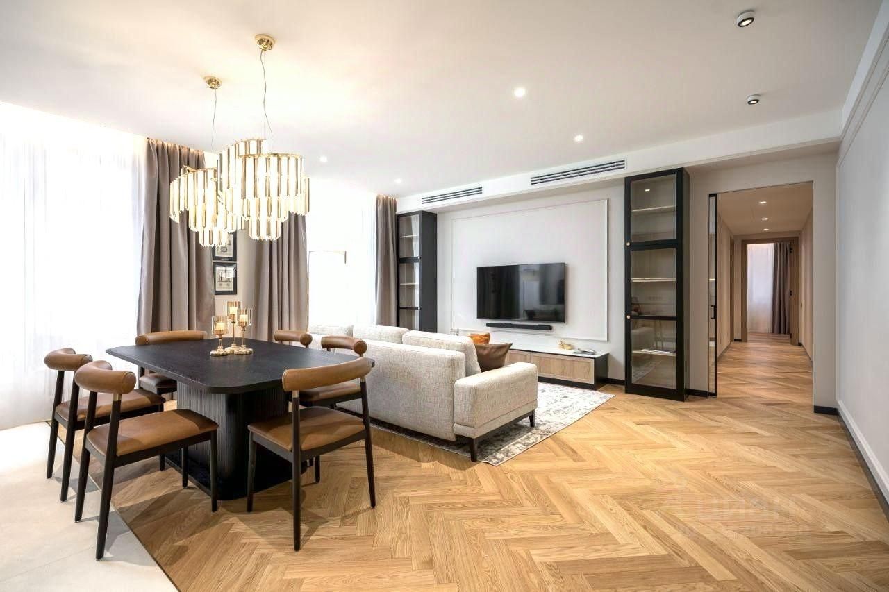 В дневной зоне с первого взгляда узнаваемый главный герой обеденный стол на восемь персон. Предметы столовой группы в стиле модернизма и две грандиозные люстры придают парадности и говорят о том что в этом доме ценят культуру общения.