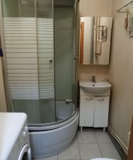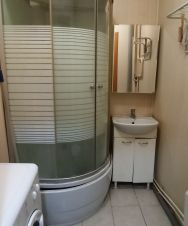 Кухня оснащена необходимой бытовой техникой, включая холодильник и плиту. Совмещенный санузел оснащен душевой кабиной и стиральной машиной.