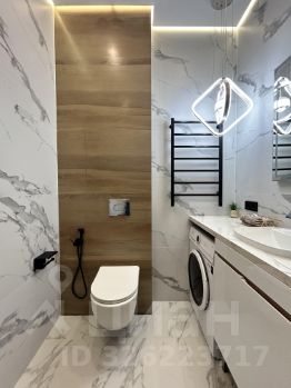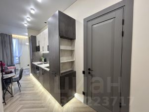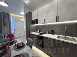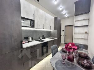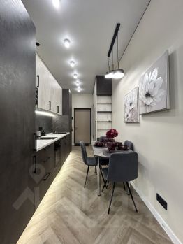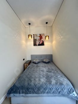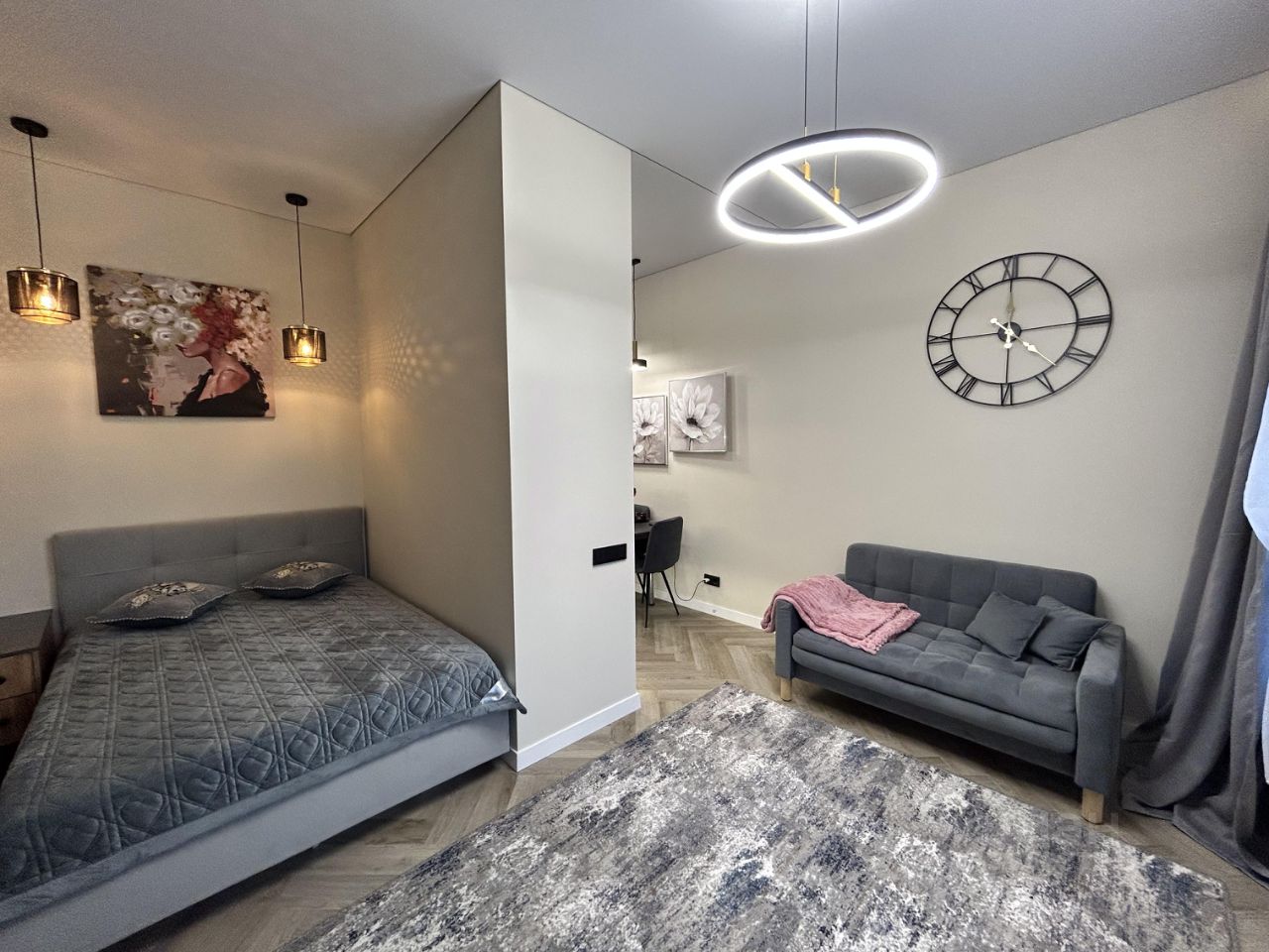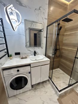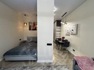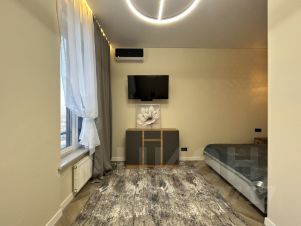 Пространство поделено на 3 зоны: кухонная зона с встроенным гарнитуром и необходимой бытовой техникой, гостиной зоной с удобным диваном, ТВ и функциональным комодом, спальная зона с двуспальной кроватью (140*200 см). В квартире красивое освещение. Санузел совмещен, установлена душевая кабина, все очень стильно и красиво.