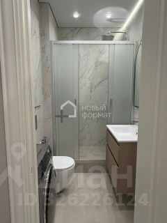 Санузел совмещен, с современным дизайном. . Стиральная машина, шкаф и зеркало с подсветкой.