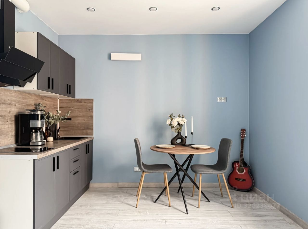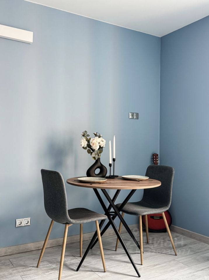 Студия выполнена в светло-голубой и мягкой серой палитре, которая создаёт ощущение лёгкости и покоя. Продуманная планировка делает пространство гармоничным и функциональным: