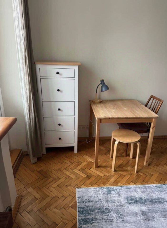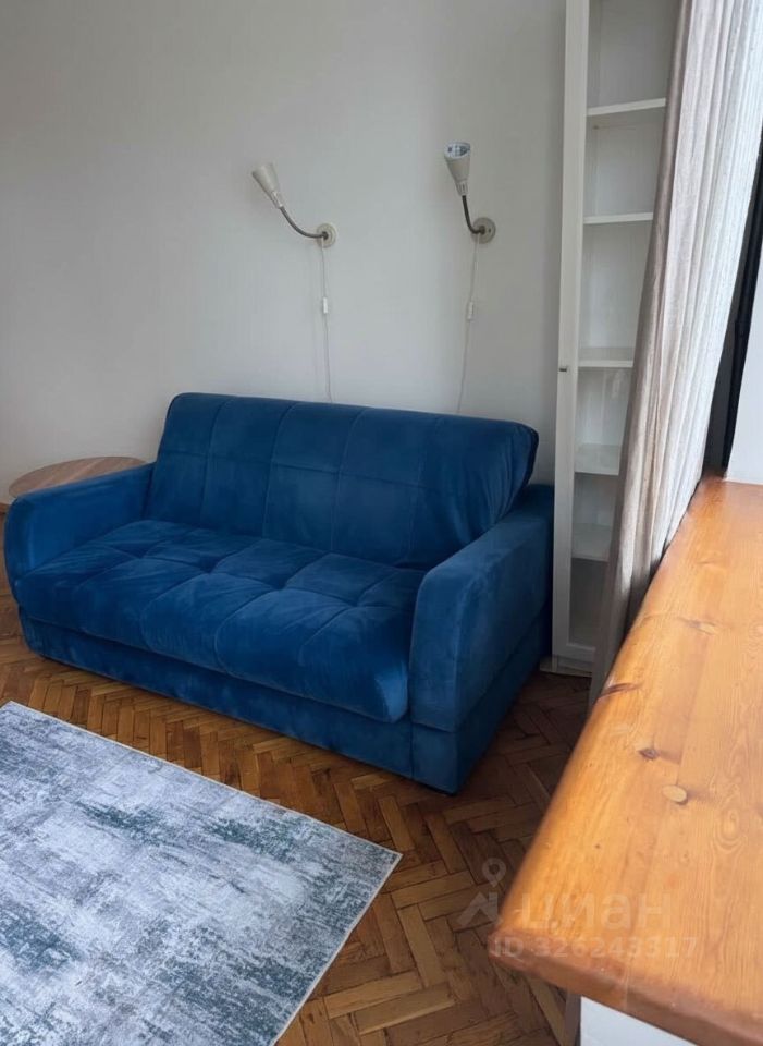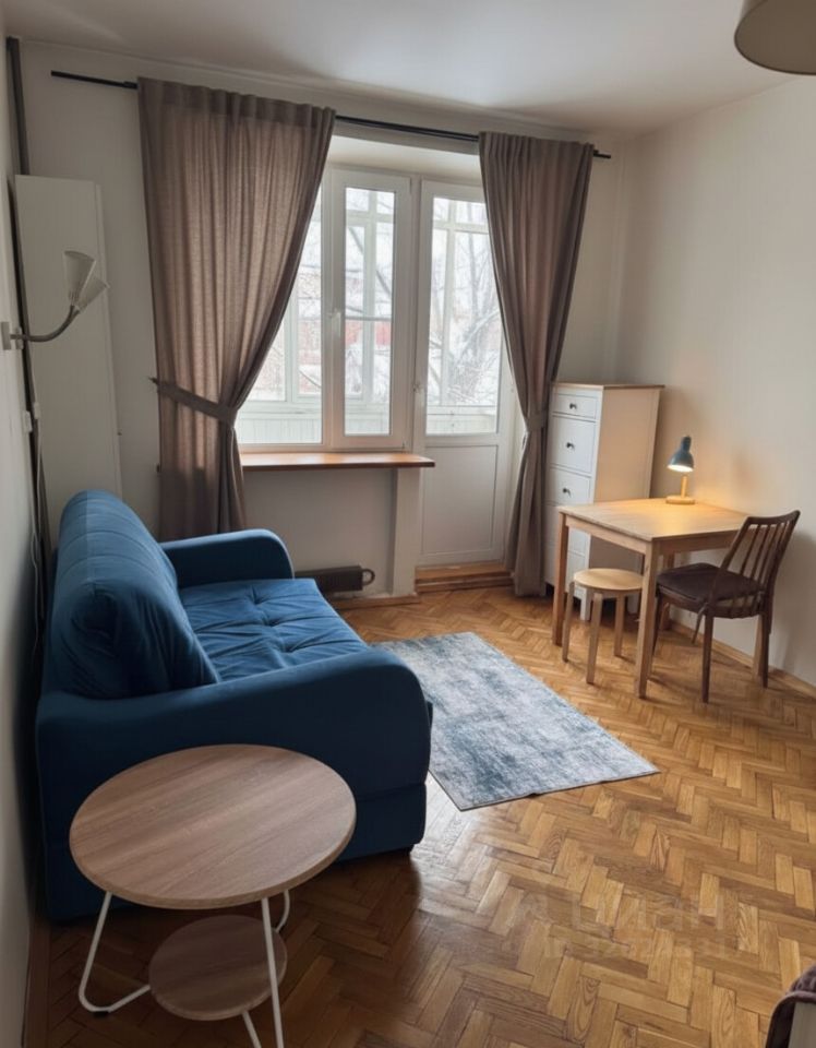 Сдается светлая однокомнатная квартира в престижном районе рядом с метро Менделеевская. Внутри выполнен качественный ремонт в приятных светлых тонах который создает ощущение чистоты и простора. В жилой комнате стоит большой современный диван насыщенного синего цвета и организована удобная зона для работы или отдыха. Высокие окна и аккуратные шторы наполняют пространство мягким светом.