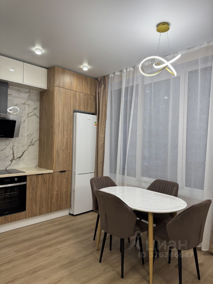 Кухня оборудована современной техникой, включая холодильник, индукционную плиту, духовку и посудомоечную машину. В гостиной установлен телевизор и удобный диван.