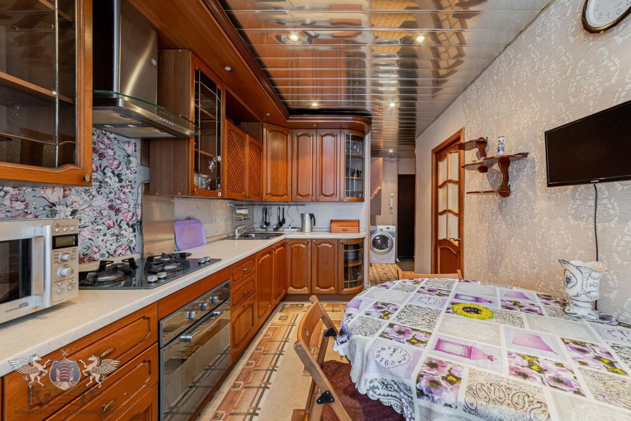 Современная кухня, большой шкаф-купе, кровать, телевизор, стиральная машина.