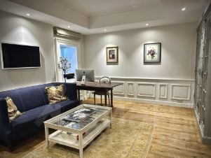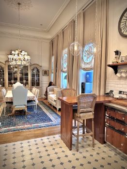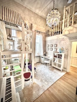 * Второй этаж: Детская комната с антресолью и потолками 6 метров ( 30 кв.м.), Хозяйская спальня (40 кв.м.) с антресолью, гардеробной и сан.узлом (12 кв.м), Холл, Столовая, кухня. Гостинная с библиотекой, Сан.узел с душевой. Выход в подьезд с консьержем.