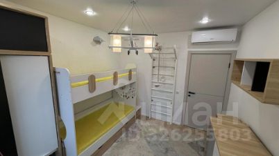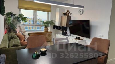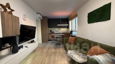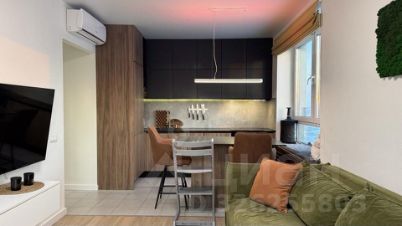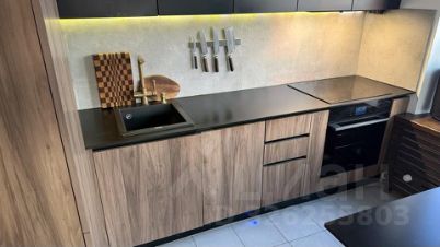 Квартира выполнена в современном стиле с продуманной эргономикой. В кухне-гостиной — встроенная техника: холодильник, ПММ, духовка, СВЧ, вытяжка, измельчитель пищевых отходов и фильтр для питьевой воды. Установлен кухонный остров-стол с тонкой столешницей, новые стулья, все розетки скрыты.