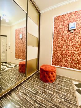При входе есть большой вместительный шкаф-купе. Кухня оснащена всей необходимой бытовой техникой (холодильник, плита, вытяжка, посудомоечная машина, телевизор)