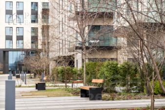 - благоустроенная территория с вишневым садом с беседками и фонтанами, спортивная площадка, уличная шахматная доска, большая и малая детские площадки, выход в парк;
