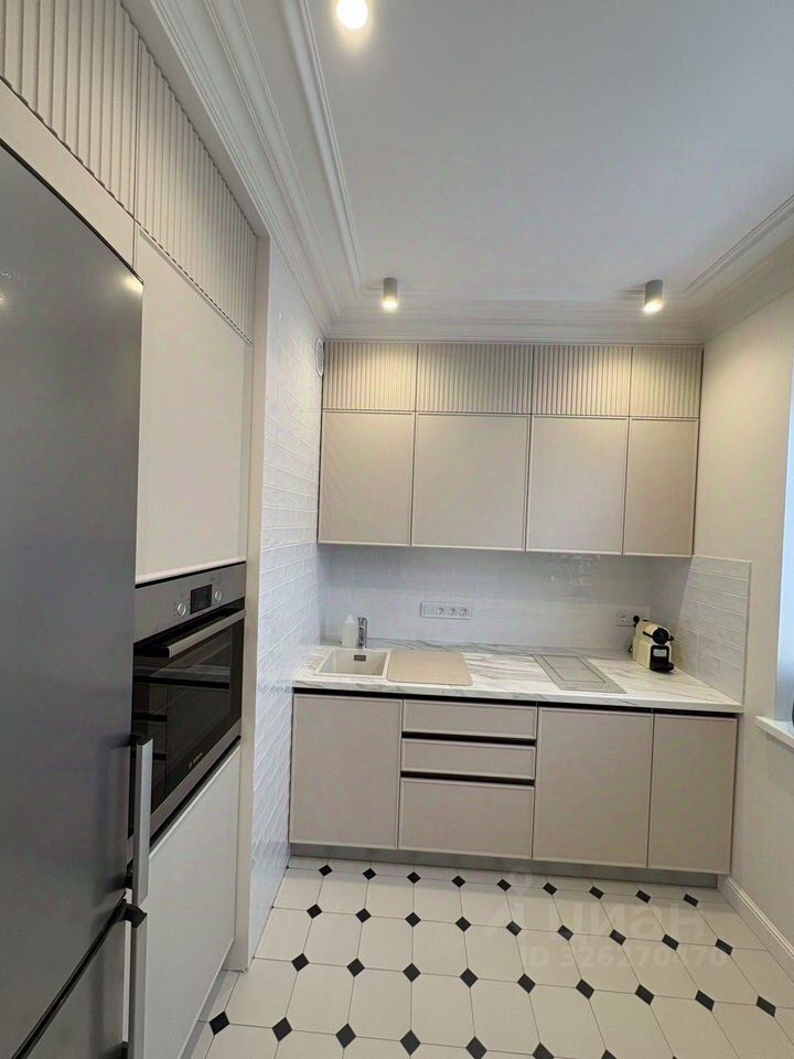 Просторная кухня площадью 10 м² оснащена всем необходимым: современной техникой, включая холодильник, духовку, варочную панель, кофемашину,