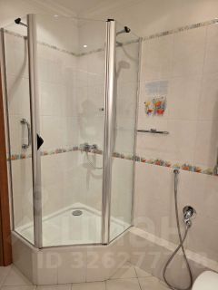 большая ванная комната: есть и ванна, и душевая, стиральная машина.