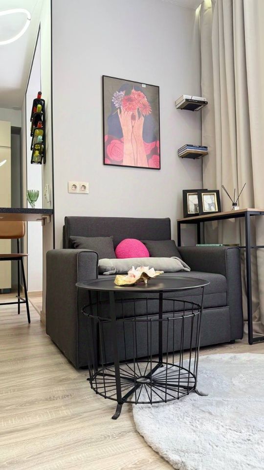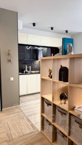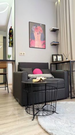 Сдаётся видовая студия в современном жилом комплексе РиверПарк, расположенном неподалёку от станции метро Нагатинский затон. Квартира 40 м², полностью меблирована. Есть удобная двуспальная кровать с подъемным механизмом, кухонный гарнитур и обеденная зона, деловая зона с письменным столом, а также зона отдыха с раскладным маленьким диванчиком и креслом.
