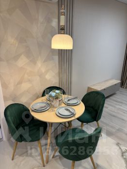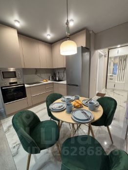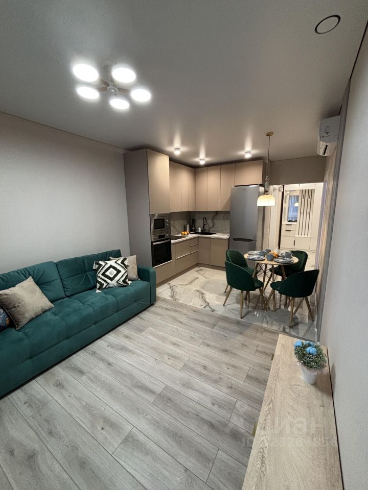 в кухне-гостиной имеется современный кухонный гарнитур со всей необходимой встроенной техникой (посудомоечная машина, микроволновая печь, духовка, варочная панель на 4 конфорки, холодильник, дистанционно включающаяся подсветка), раскладной двуспальный диван с местом для хранения, подвесная тумба, шторы блэкаут, большой телевизор Smart TV-на фотографиях его нет), уютная обеденная зона;