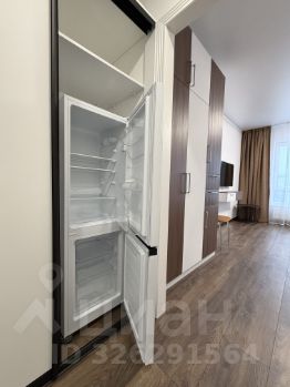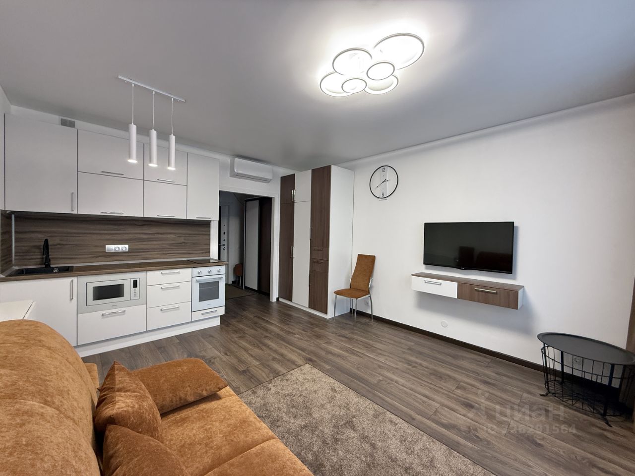 Студия полностью укомплектована мебелью и техникой: телевизор, холодильник, кондиционер, стиральная машина, встроенные варочная панель, духовой шкаф и микроволновая печь.