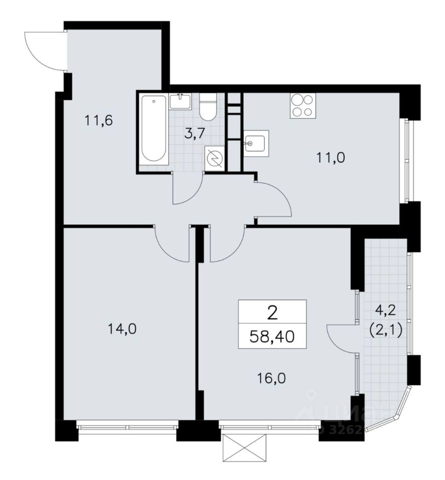 В квартире 2 изолированных комнаты, большая кухня, балкон.