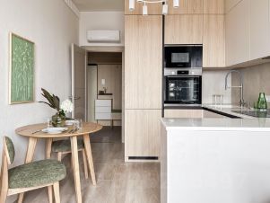 Интерьер выполнен в спокойной натуральной гамме: тёплые оттенки, дерево, качественный текстиль и мягкий свет. Пространство выглядит цельным, спокойным и очень аккуратным.