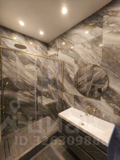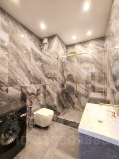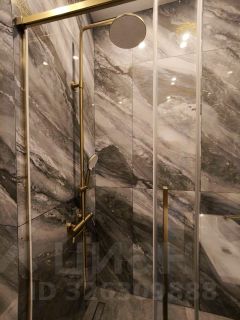 Санузел совместный в плитке из керамогранита до потолка. Душевая кабина. Гигиенический душ.