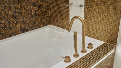В закатном солнце в панорамное окно спальни заглядывают Лужники, Дом Правительства, сталинские высотки и уходящие за горизонт московские набережные, превращаясь в личную коллекцию видов, доступную только тебе. Ванна с зелёным бонсаем выглядит как личный спа-салон.